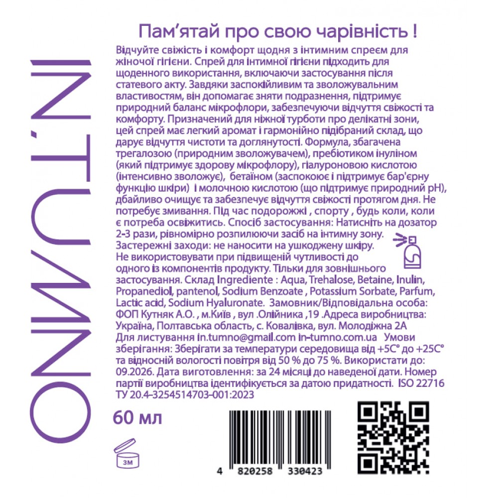 Спрей In.Tumno 5в1 — це щоденний засіб інтимного догляду, створений для підтримки комфорту та свіжості. Формула містить до 99 % інгредієнтів природного походження та сприяє збереженню природного балансу шкіри.