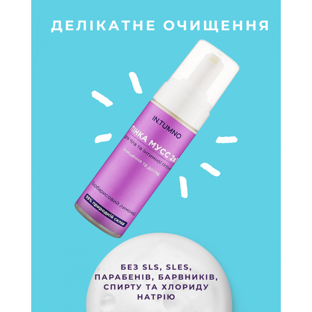 Пінка-мус 2в1 для тіла та інтимної гігієни — це ніжний засіб для щоденного очищення та догляду, який об’єднує функції двох продуктів в одному. Легка текстура мусу делікатно очищає шкіру, не порушуючи природного балансу, дарує м’якість і тривале відчуття свіжості.Пінка-мус для інтимної гігієни від бренду In.Tumno – це ніжний формат щоденного очищення, який дарує комфорт і відчуття свіжості. Легка текстура мусу робить процес миття приємним, а ретельно підібрані компоненти забезпечують дбайливий догляд.