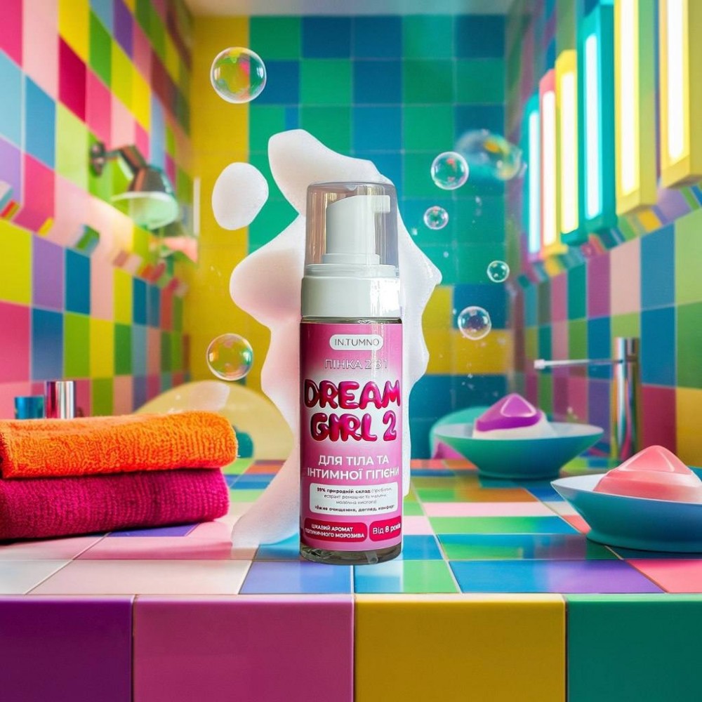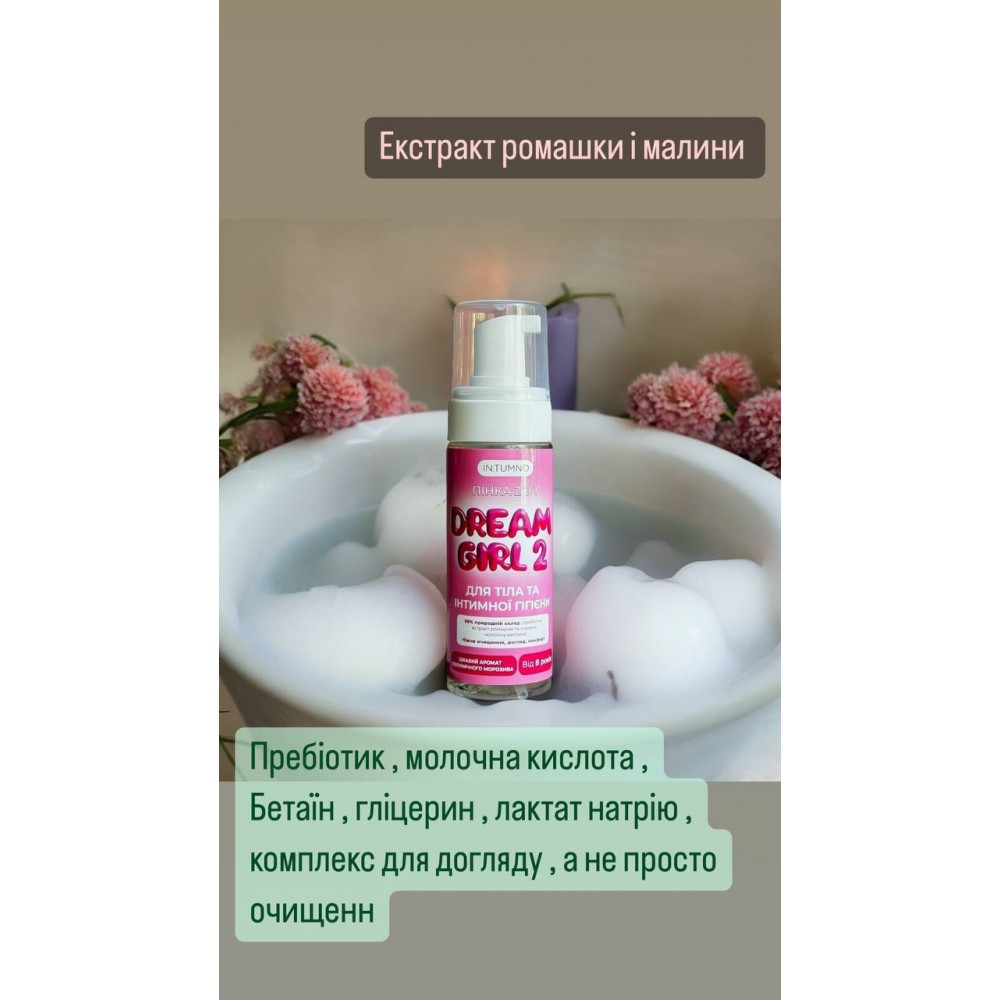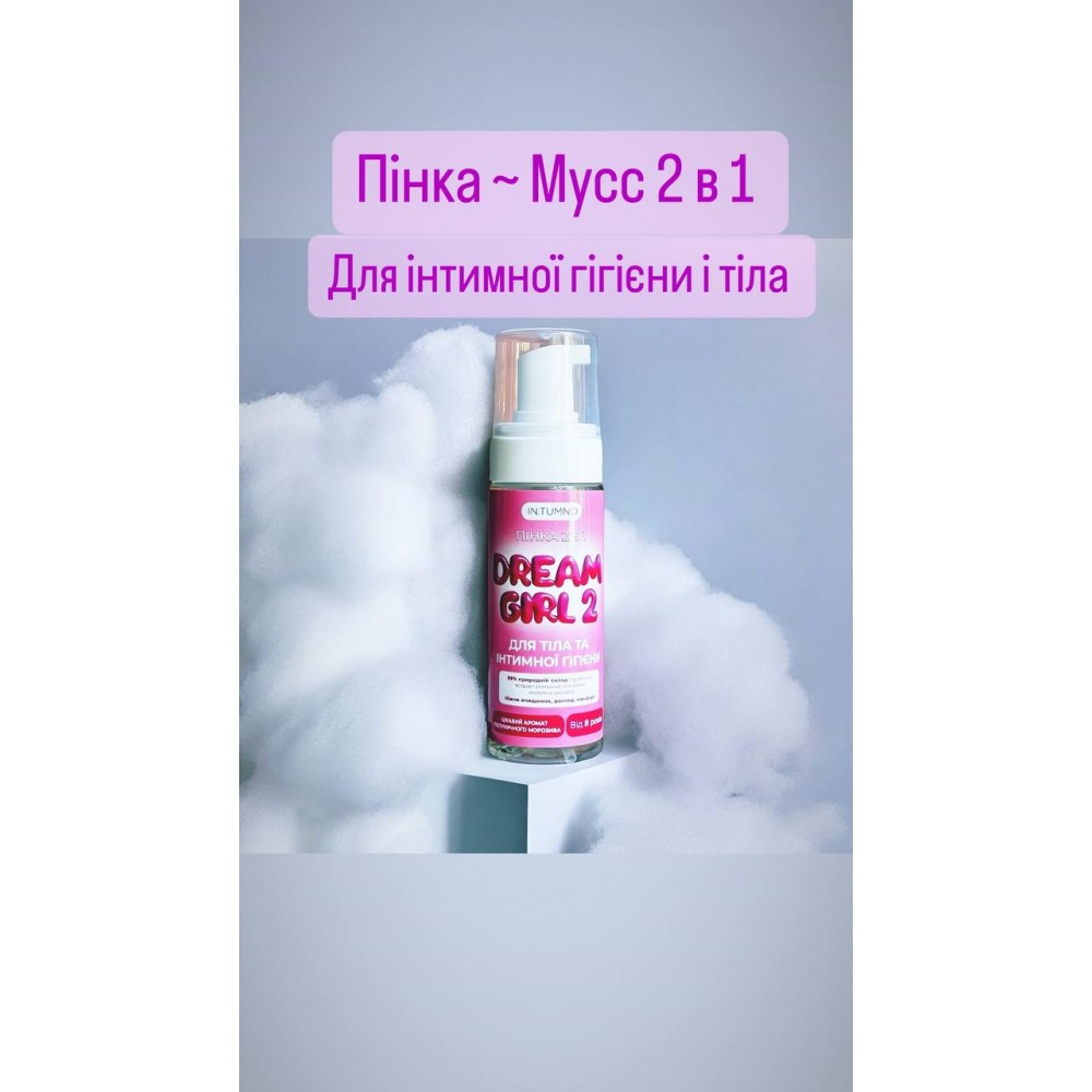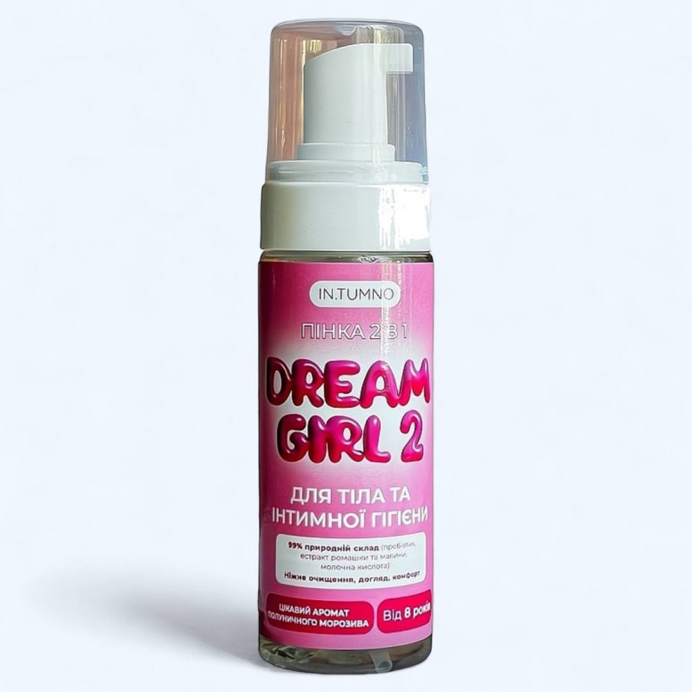 Пінка-мусс 2 в 1 Dream Girl від бренду In.Tumno - це ніжна турбота та догляд, спеціально розроблена для дівчаток від 9 років . Цей продукт поєднує в собі догляд за інтимною гігієною та тілом, що робить його ідеальним вибором для перехідного віку, коли закладаються основи жіночого здоров'я та формуються звички на все життя. Пінка-мусс створена з урахуванням фізіологічних та психологічних особливостей дівчаток від 8 років, даруючи їм впевненість та комфорт кожного дня.