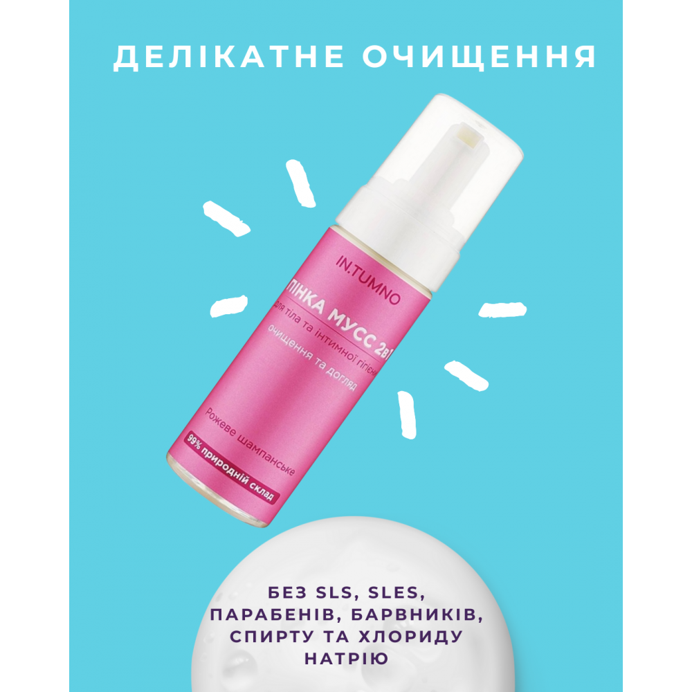 Пінка-мус від бренду In.Tumno — це особливий засіб для делікатного щоденного очищення, який поєднує в собі турботу, м’якість і комфорт. Завдяки до 98 % природних компонентів,Пінка-мус для інтимної гігієни від бренду In.Tumno – це ніжний формат щоденного очищення, який дарує комфорт і відчуття свіжості. Легка текстура мусу робить процес миття приємним, а ретельно підібрані компоненти забезпечують дбайливий догляд.